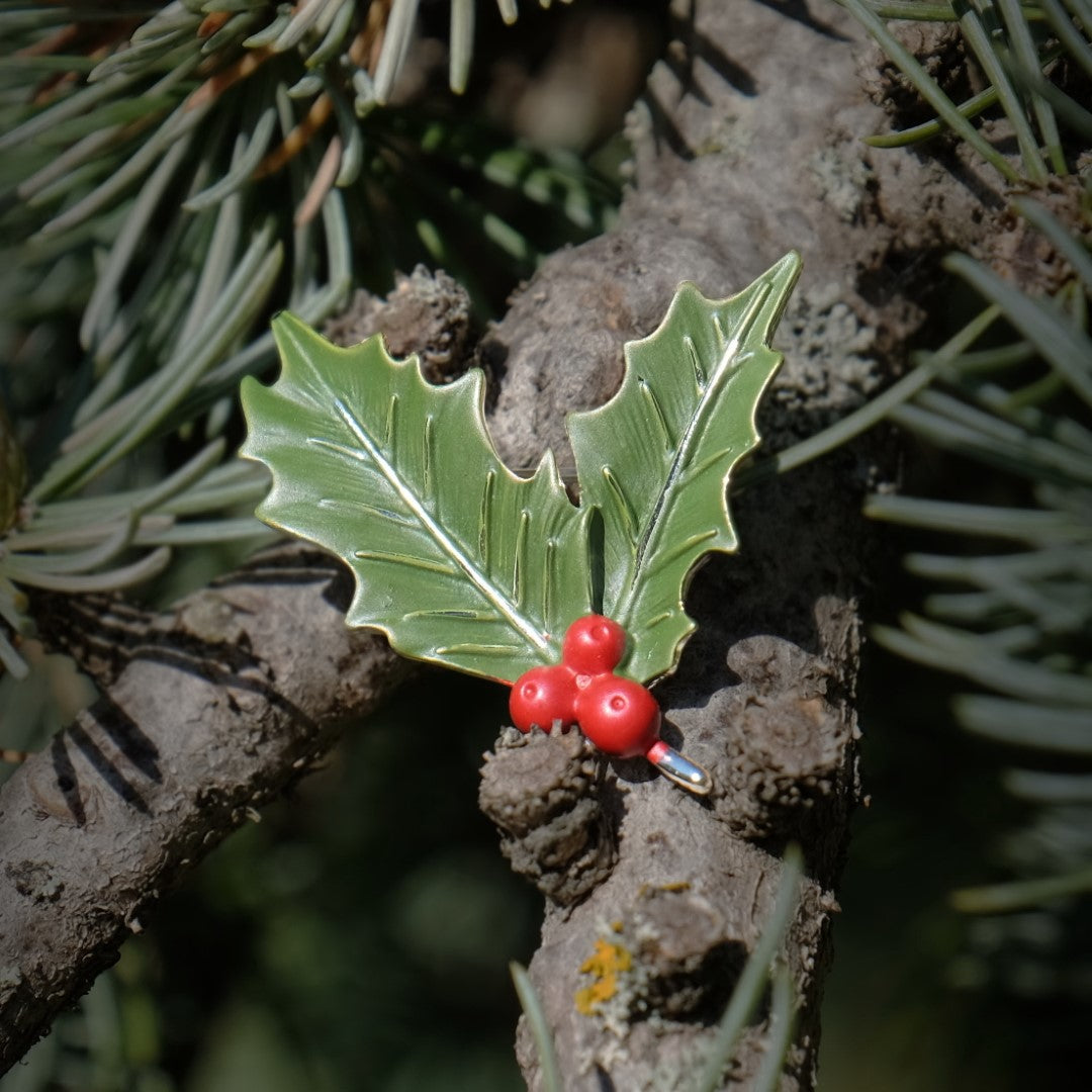 This brooch embodies nature, with its intricate design and attention to detail. Bring a little festive joy to any outfit this Christmas season with this Christmassy brooch. Crisp green Holly leaves and red berries are a classic winter foliage, traditionally used to decorate homes at Christmas, this brooch allows that subtle Christmas decoration to apply to any outfit.