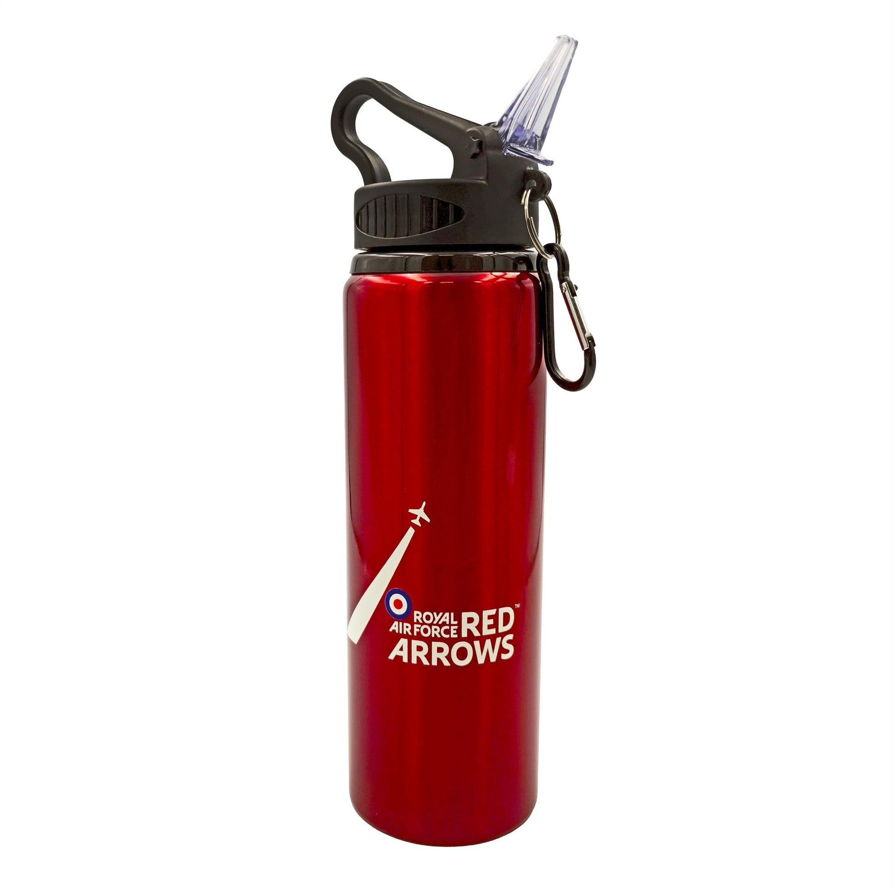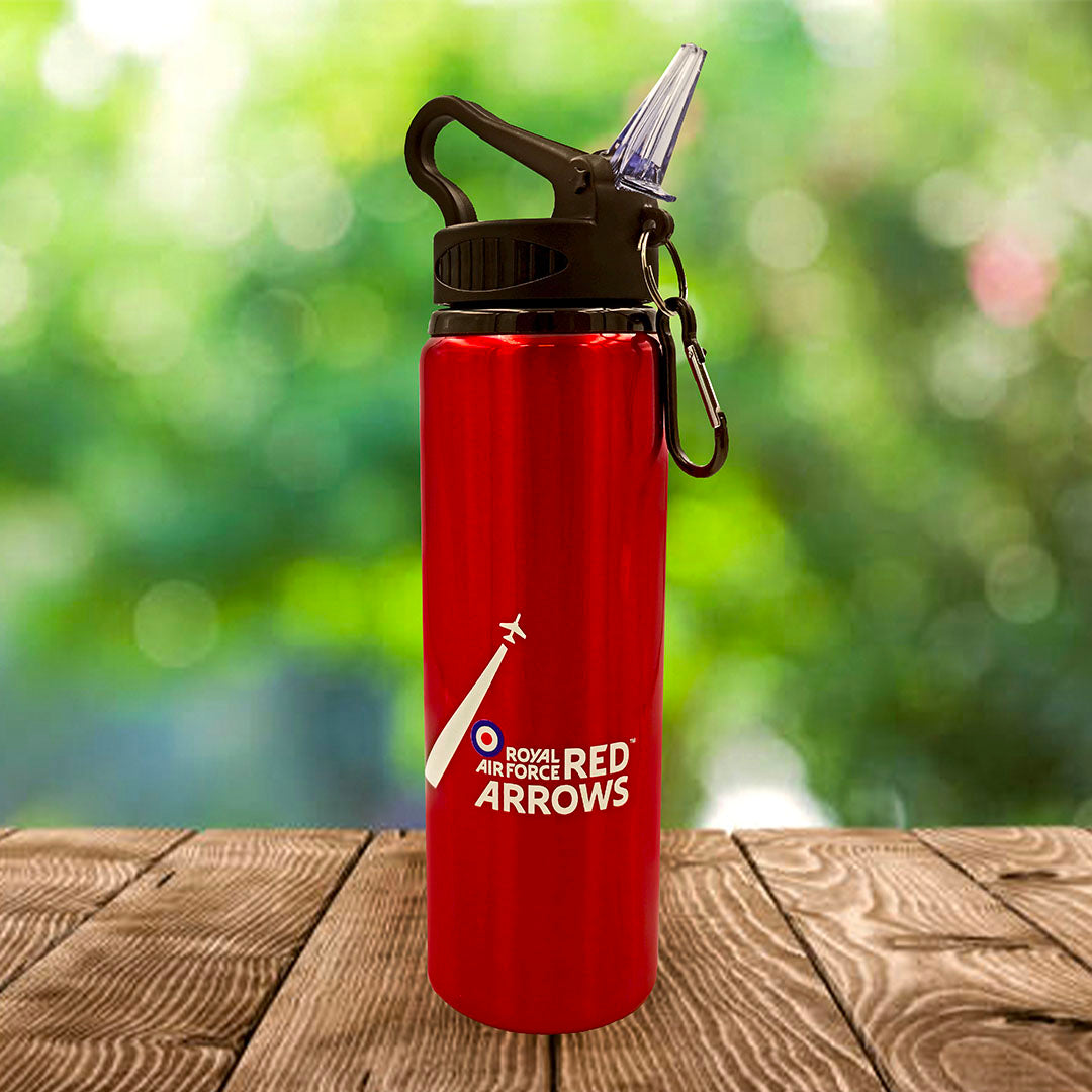 Red Arrows 800ml Bottle. This aluminium Red Arrows drinks bottle is the perfect option for on the go activities, travelling, the gym, and attending airshows! In a vibrant red colour and prominently featuring the official Red Arrows logo it is stylish too.