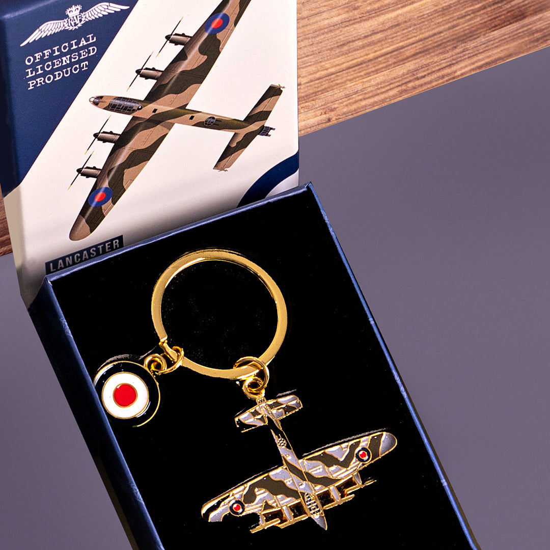 Lancaster Enamel Keyring. Instantly transform keys into a stylish accessory with this RAF enamel keyring. Featuring a Lancaster Bomber aircraft design, this high-quality keyring celebrates Britain's aviation heritage.