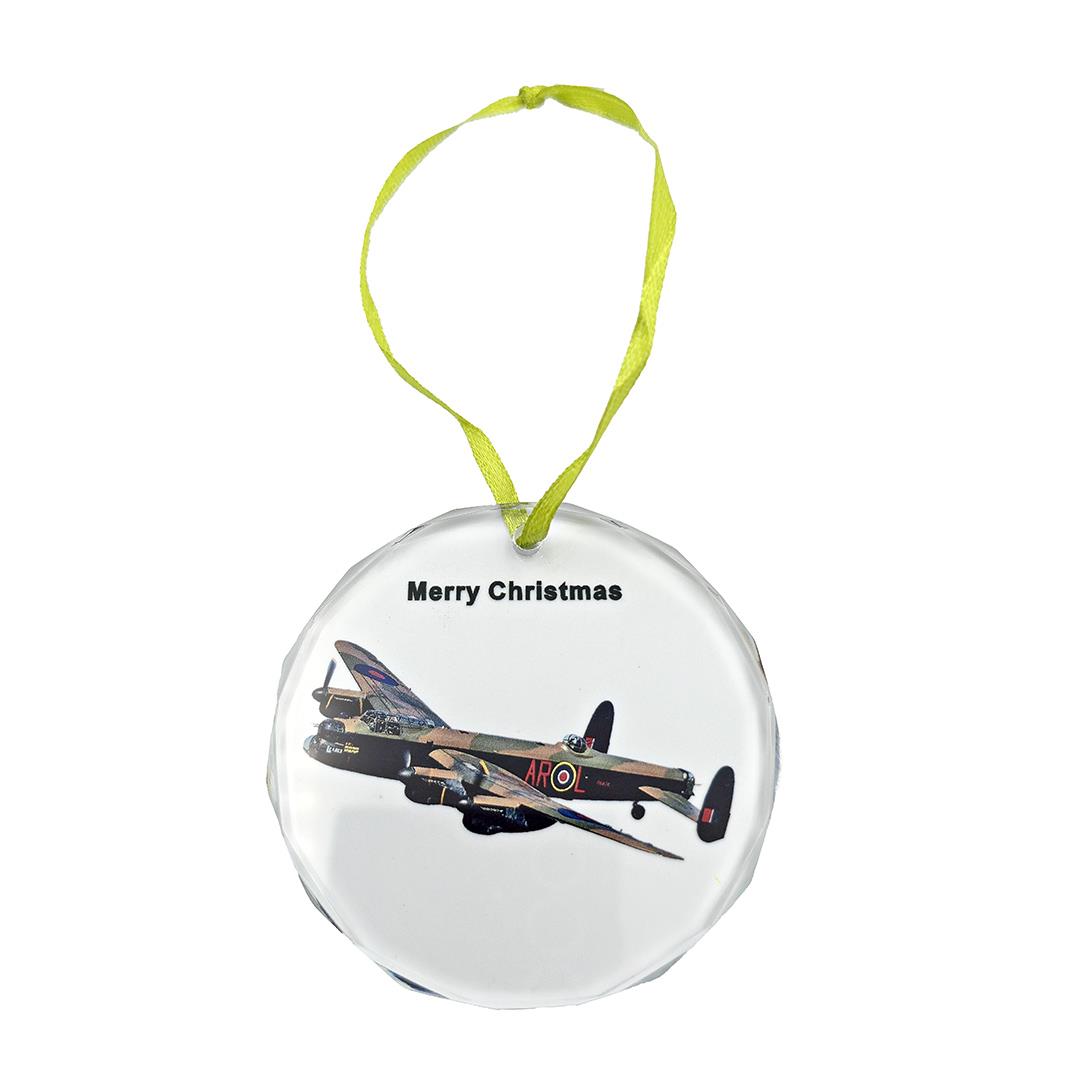 Lancaster Glass Christmas Decoration. A beautiful glass circle Christmas decoration featuring the iconic RAF Lancaster Bomber aircraft flying.