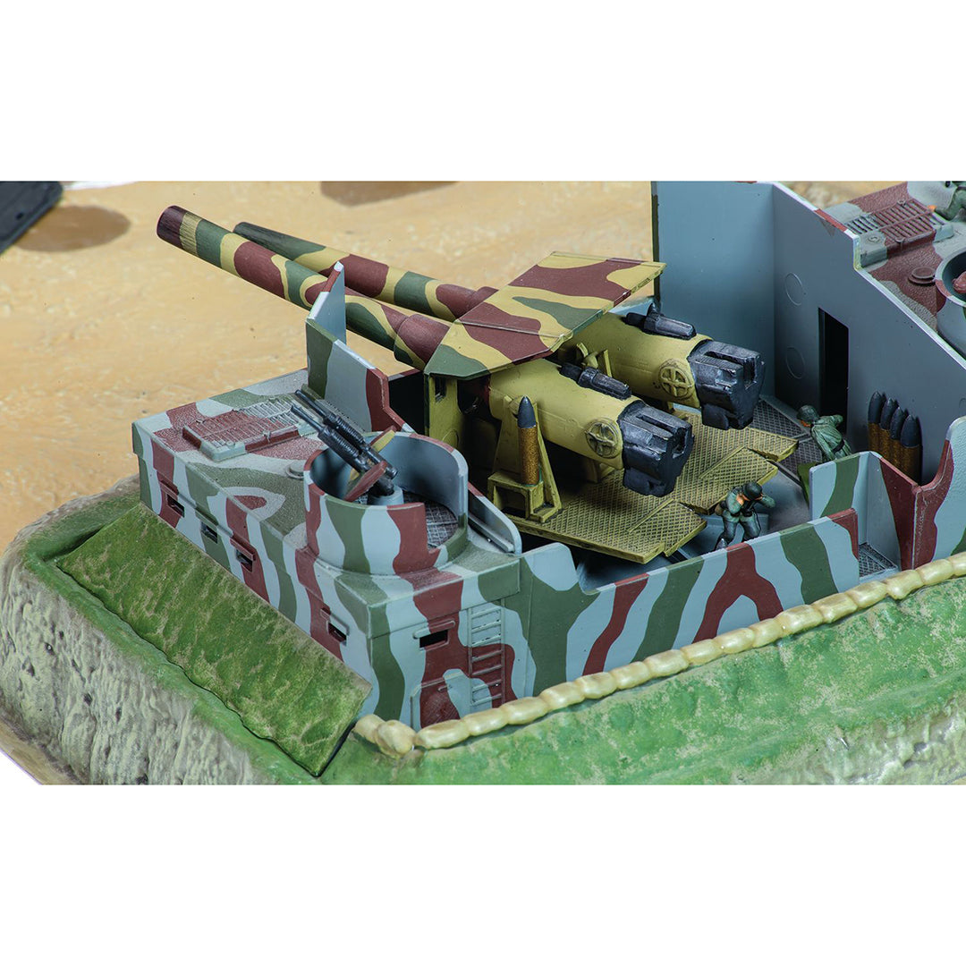 The landings themselves were preceded both by a powerful air attack and by a fierce naval artillery barrage from a vast armada of ships anchored off-shore. The majority of the beaches were taken with casualties, but no severe losses, except for Omaha where the American troops were pinned down after the naval bombardment failed to destroy the German defences. But even this obstacle was overcome and once the beach-heads were secure, Allied troops and equipment were quickly brought ashore, ready to continue on and liberate the occupied countries of Western Europe and ultimately to defeat Germany and win the war. This collection comes from the Normandy beach-head, with tanks, landing craft, trucks, a gun emplacement, soldiers and a diorama base to enable you to recreate this momentous day.