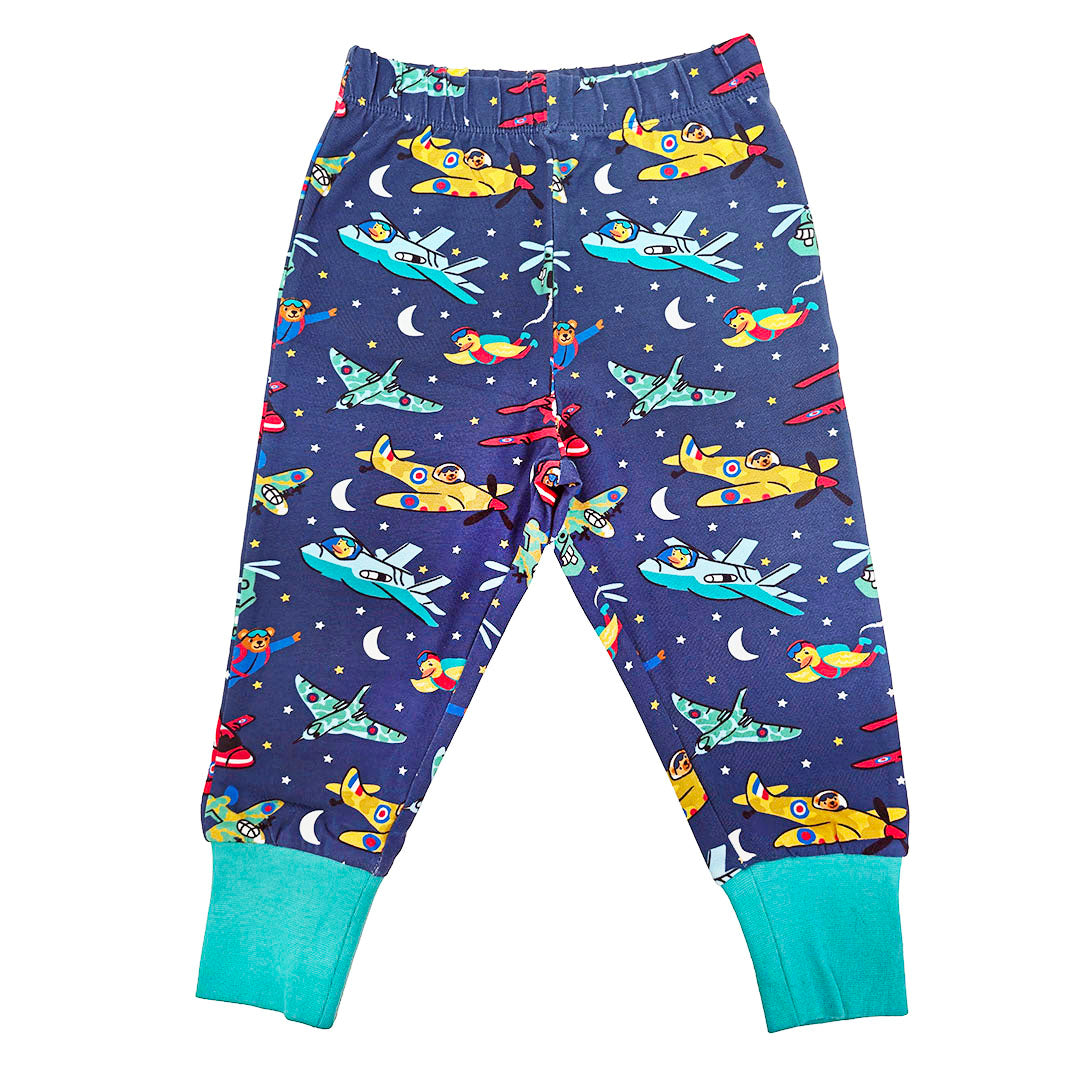 Aircraft Kids Pyjamas ages 1 - 12 years. These exclusive soft organic cotton kids pyjamas have a playful print featuring teddy bear and duck pilots and parachutists. Alongside moons and stars are cartoon style RAF Aircraft such as; the Red Arrows Hawk's, Chinook's, Vulcan's, Spitfire's, F-35's and Lancaster's.