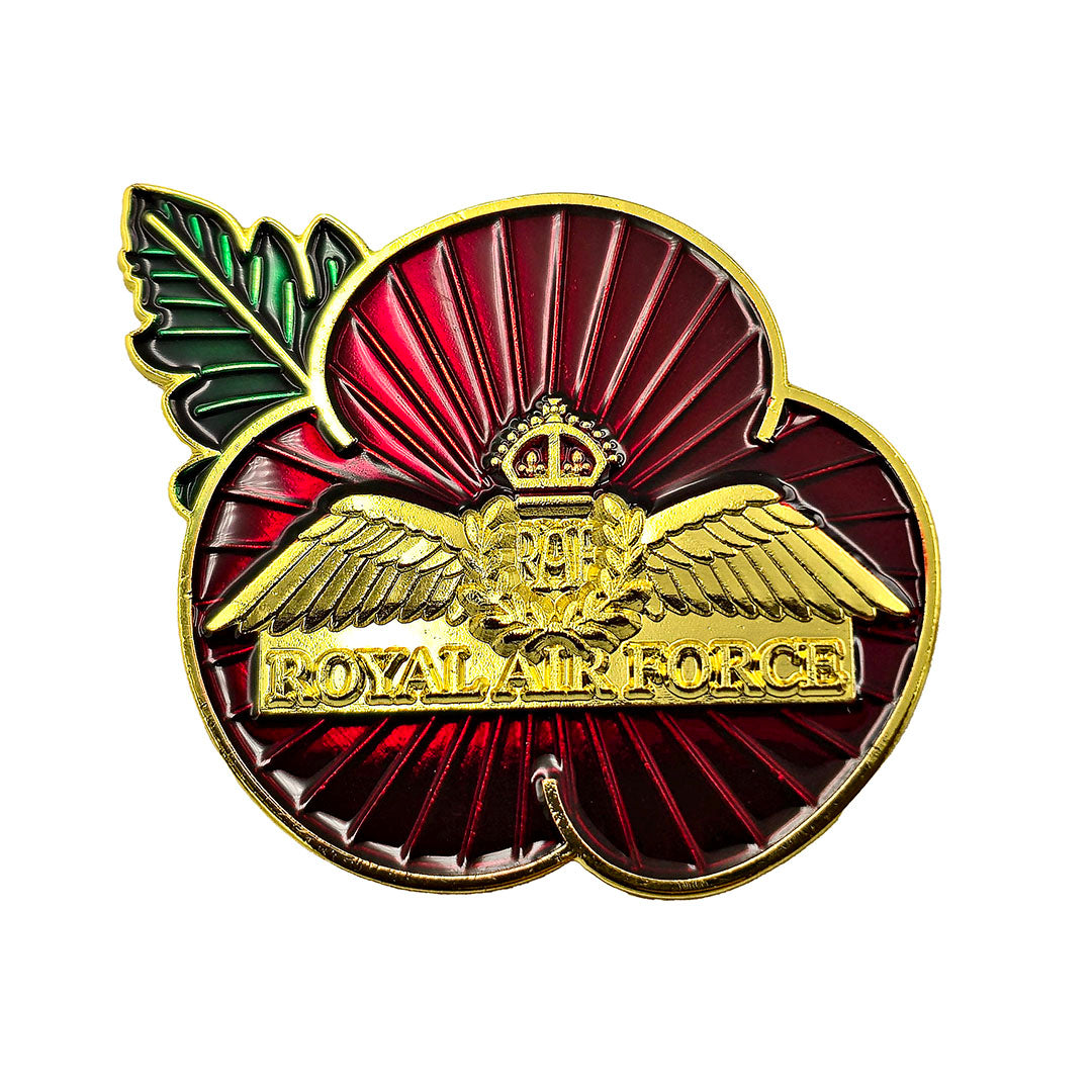 RAF Wings Poppy Pin Badge. This red Remembrance Poppy pin badge brooch with the iconic gold effect RAF Wings is ideal to wear at any occasion of remembrance.