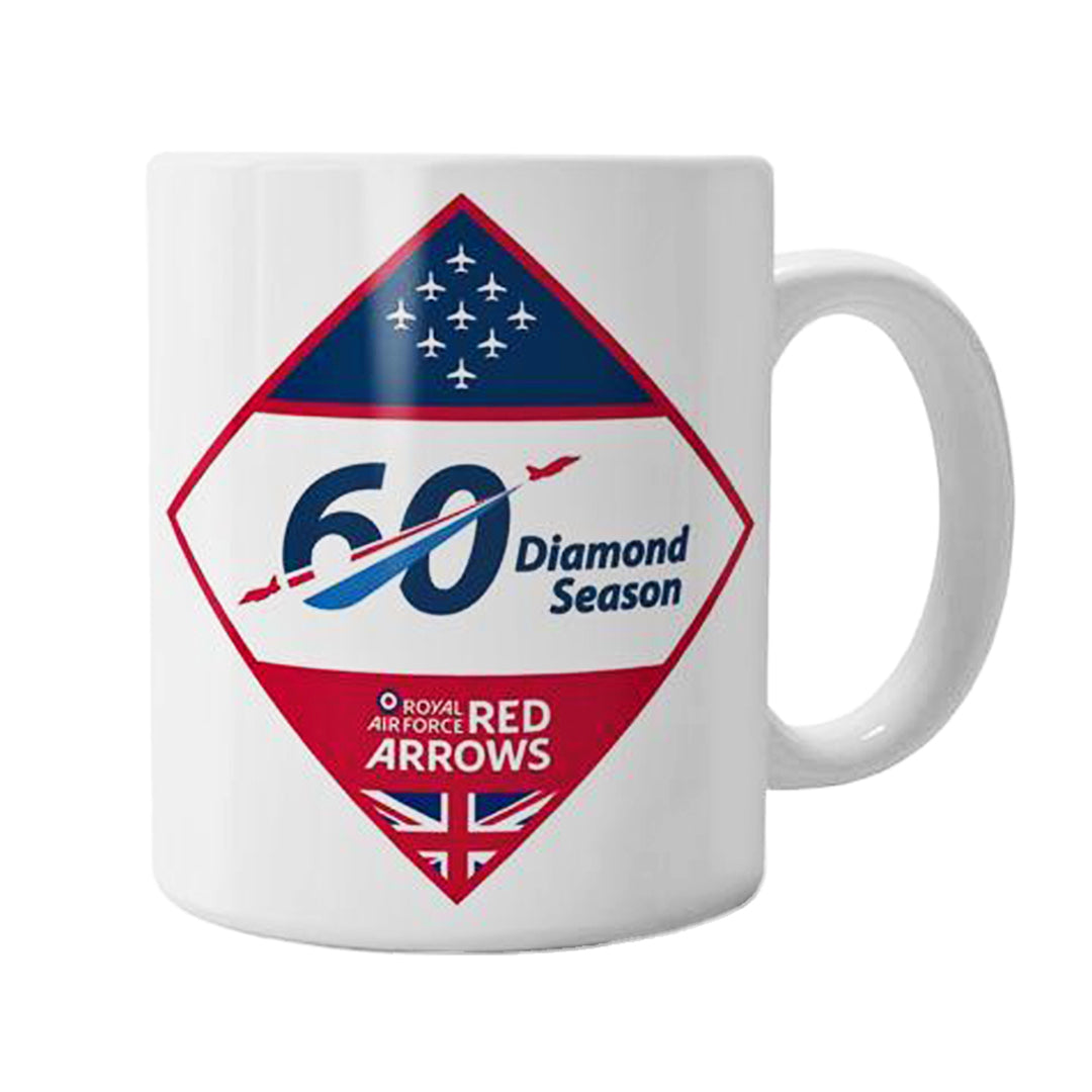 Red Arrows 60th Diamond Season mug. This Red Arrows ceramic mug features the official MOD licensed 60th Diamond Season logo on a white ceramic mug. The red, white and blue diamond design highlights the Red Arrows world famous aerobatic display teams signature, Diamond 9 formation, alongside the Red Arrows logo and the Union Jack.