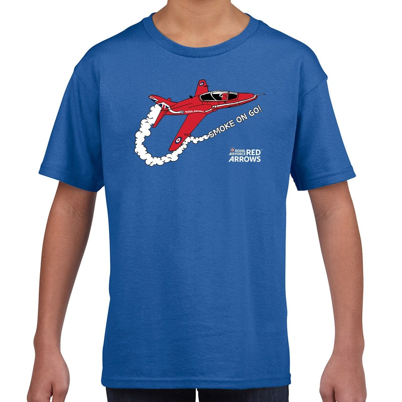 Red Arrows Kids Smoke on Go T-Shirt -  This crew neck t-shirt features a graphic print of an iconic Red Arrows jet in flight, with the text 'Smoke on Go' and the Red Arrow logo. This quirky tee is perfect for any budding young aviation fan and comes in a range of colours to suit any future pilot.