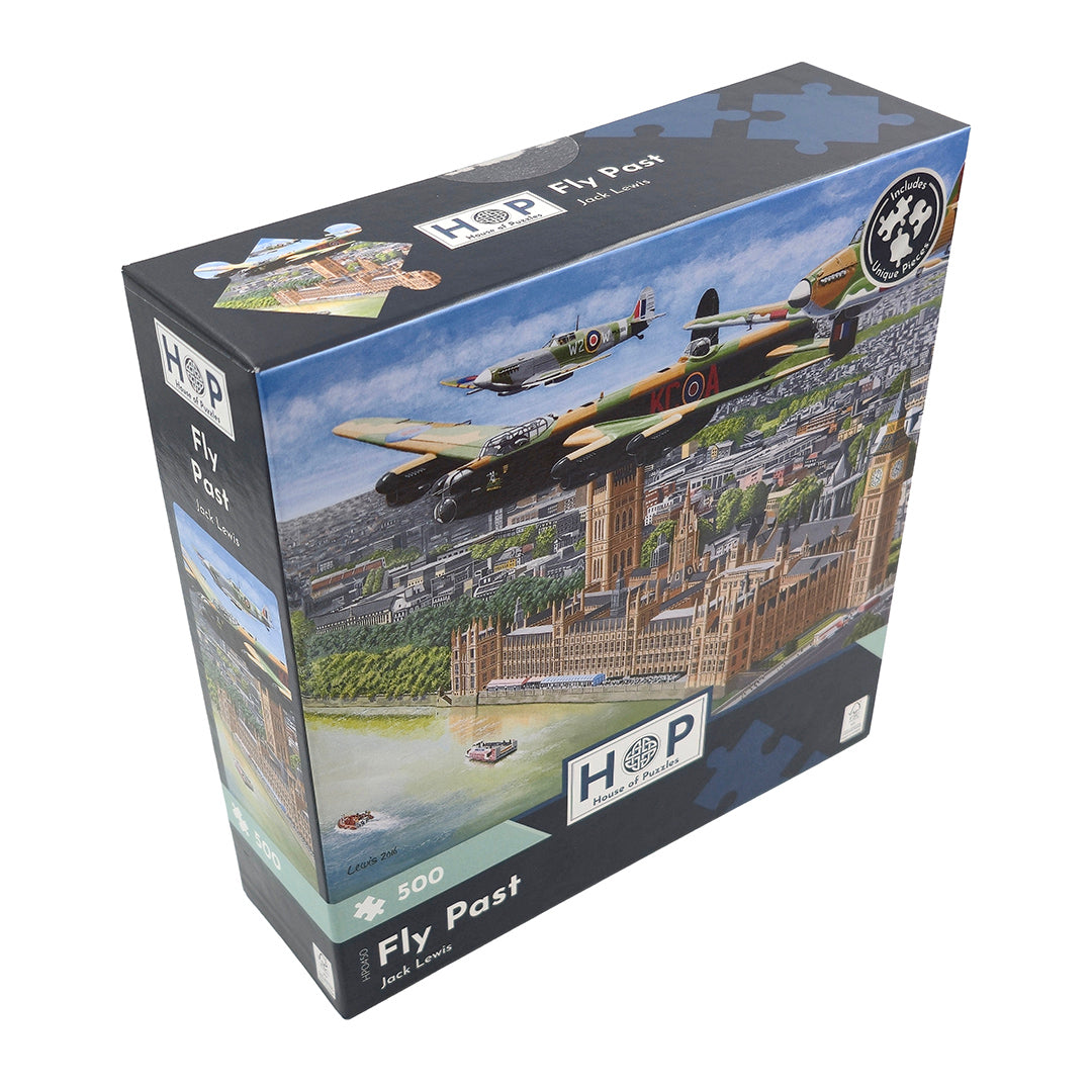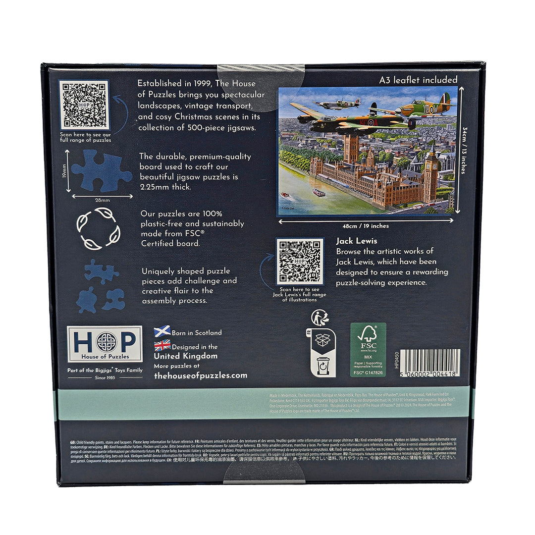 Battle of Britain Memorial Flight 500 piece puzzle featuring the Avro Lancaster, Spitfire and a Hawker Hurricane doing a fly past over the palace of Westminster. Made in the UK, original artwork by Jack Lewis.