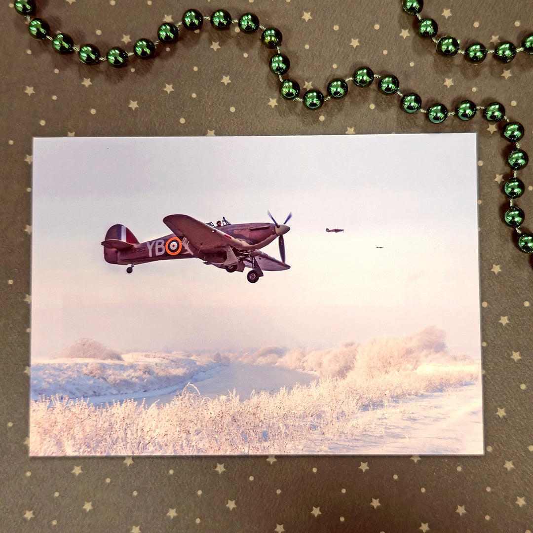 Frozen Flight Christmas Card. This beautifully designed Christmas card features a winter landscape scene with a fleet of aircraft flying over livestock and a frozen river .