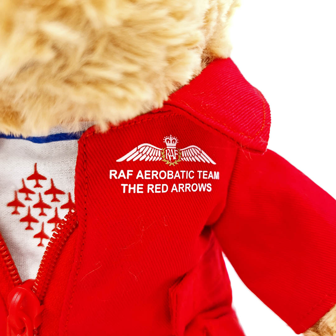 A beautifully detailed and removable Red Arrows Display Team flight suit. The suit features the Red Arrows crest, union jack and Red Arrows logo badges, with a zip fastening and velcro. To finish the outfit is an under layer featuring stripes and the Diamond 9 logo.