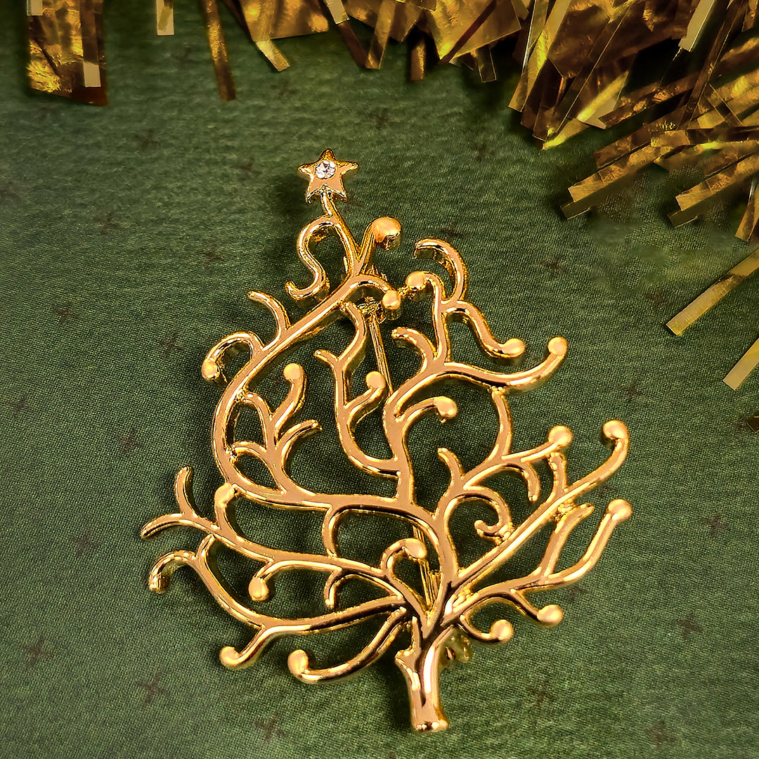 Christmas Tree Filigree Brooch - This hand enamelled gold brooch has filigree branches and a gold star with a crystal centre. This brooch embodies nature, with its intricate design and attention to detail. Bring a little festive joy to any outfit this Christmas season with this elegant brooch.