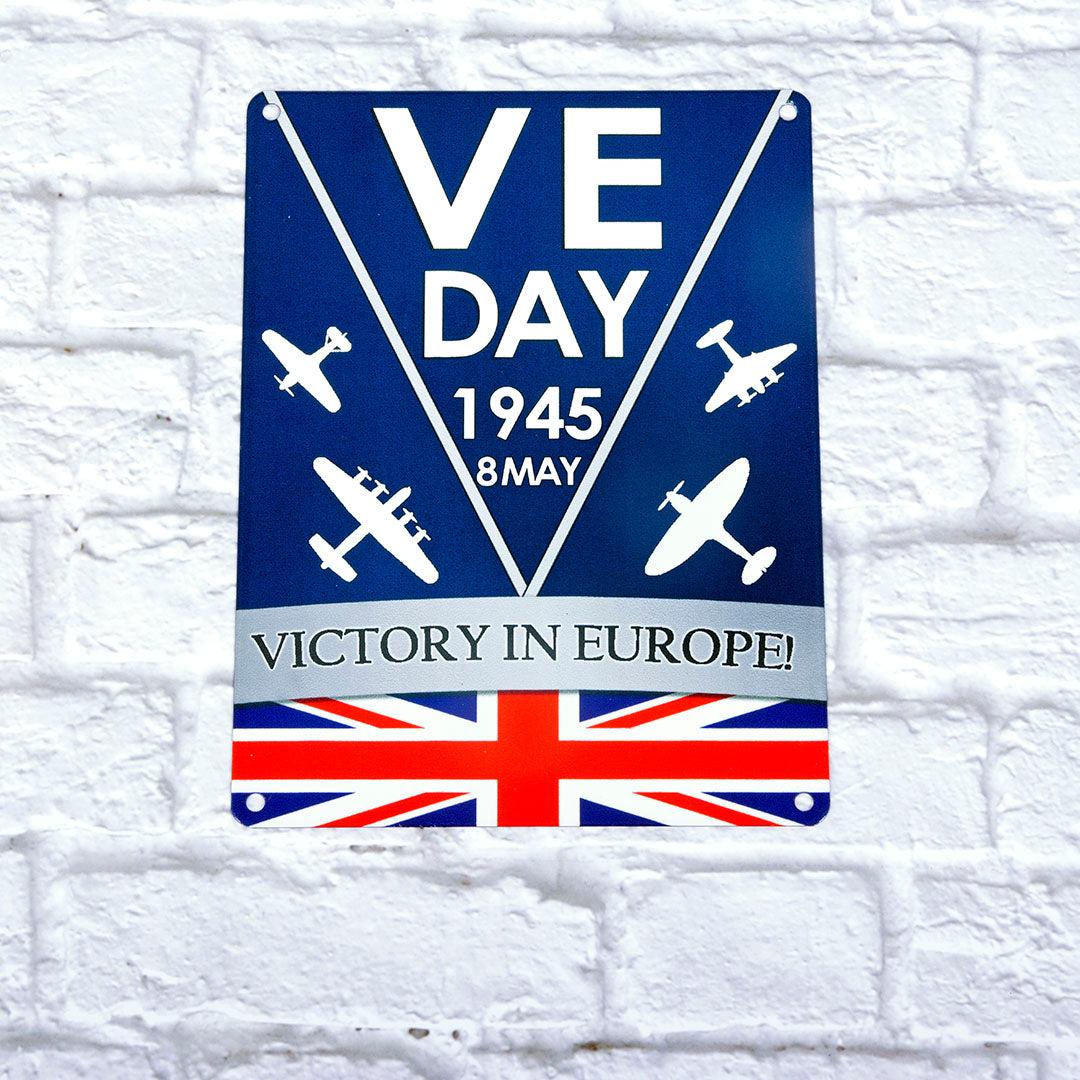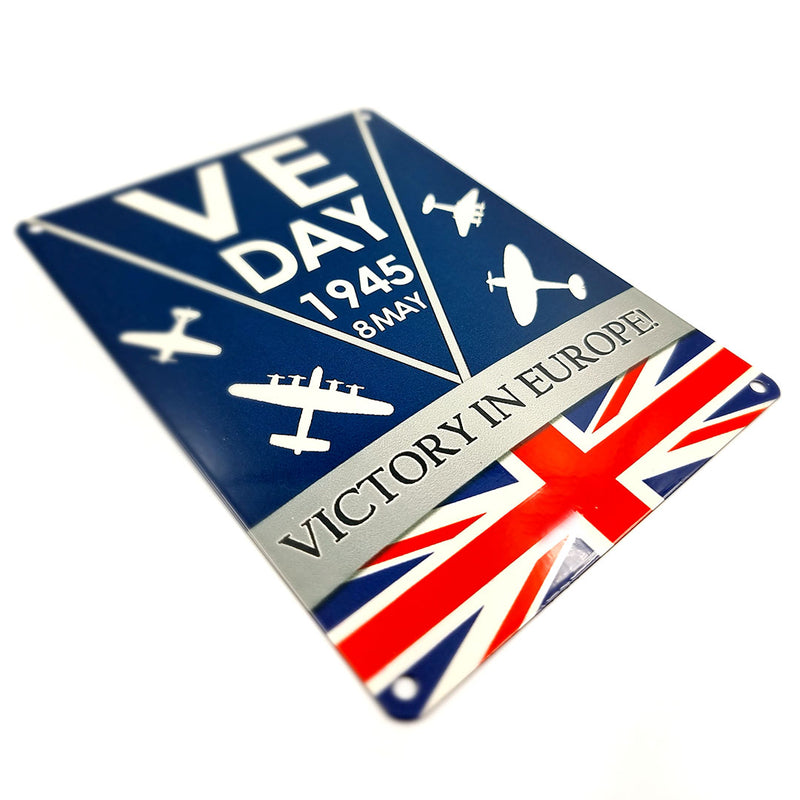 This commemorative VE Day mini blue metal sign - 150 x 200mm and is designed, created and manufactured within the United Kingdom from recycled steel and come with pre-drilled holes in each corner for easy hanging. This is the perfect gift for any VE Day or aviation enthusiast.