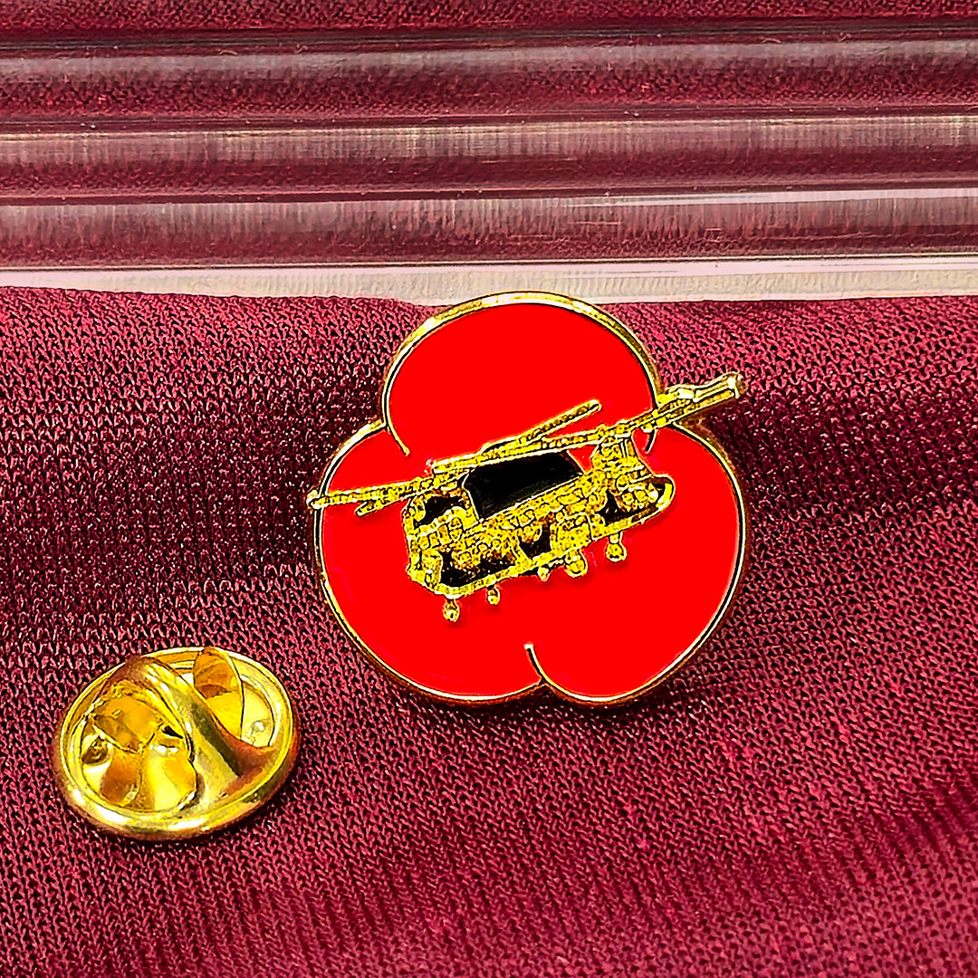 This mini 3 petal Chinook poppy pin stud features a gold effect Chinook aircraft flying across a bold red poppy. Smaller than our main Remembrance poppy range these pins are a new addition to our popular pin badge collection.
