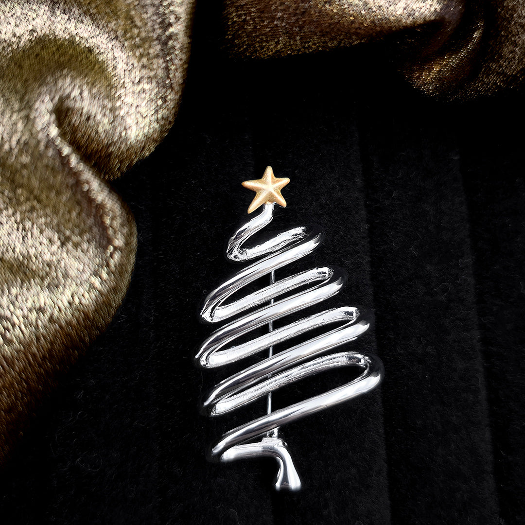Christmas Tree Minimalist Brooch - This minimalist Christmas Tree brooch has a hand enamelled gold star on top of a simple silver-tone swirled branch contemporary design.