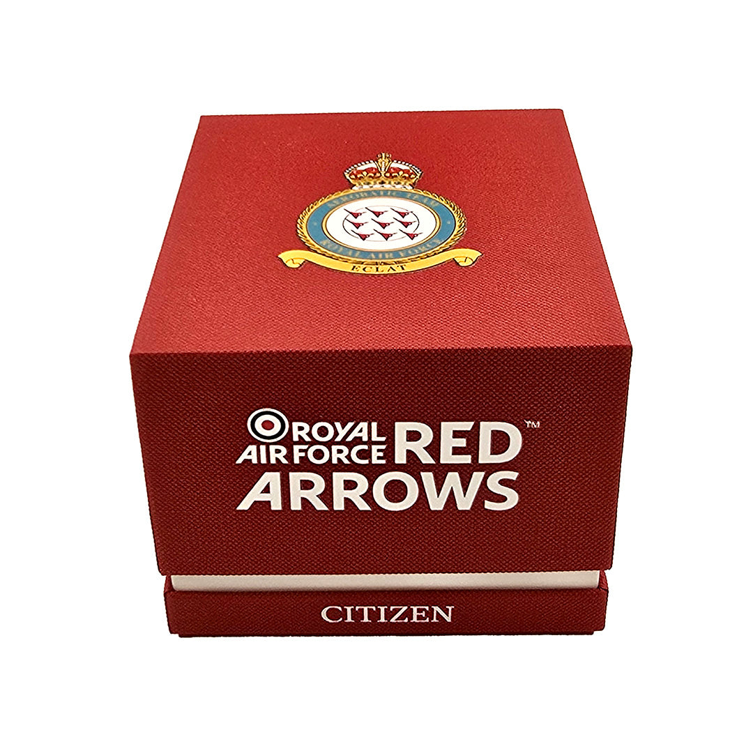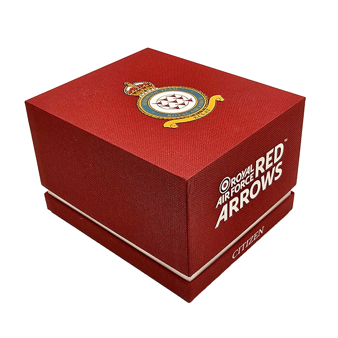 Official RAF Red Arrows insignia is engraved on the case back and presented in a red Citizen Red Arrows presentation box.