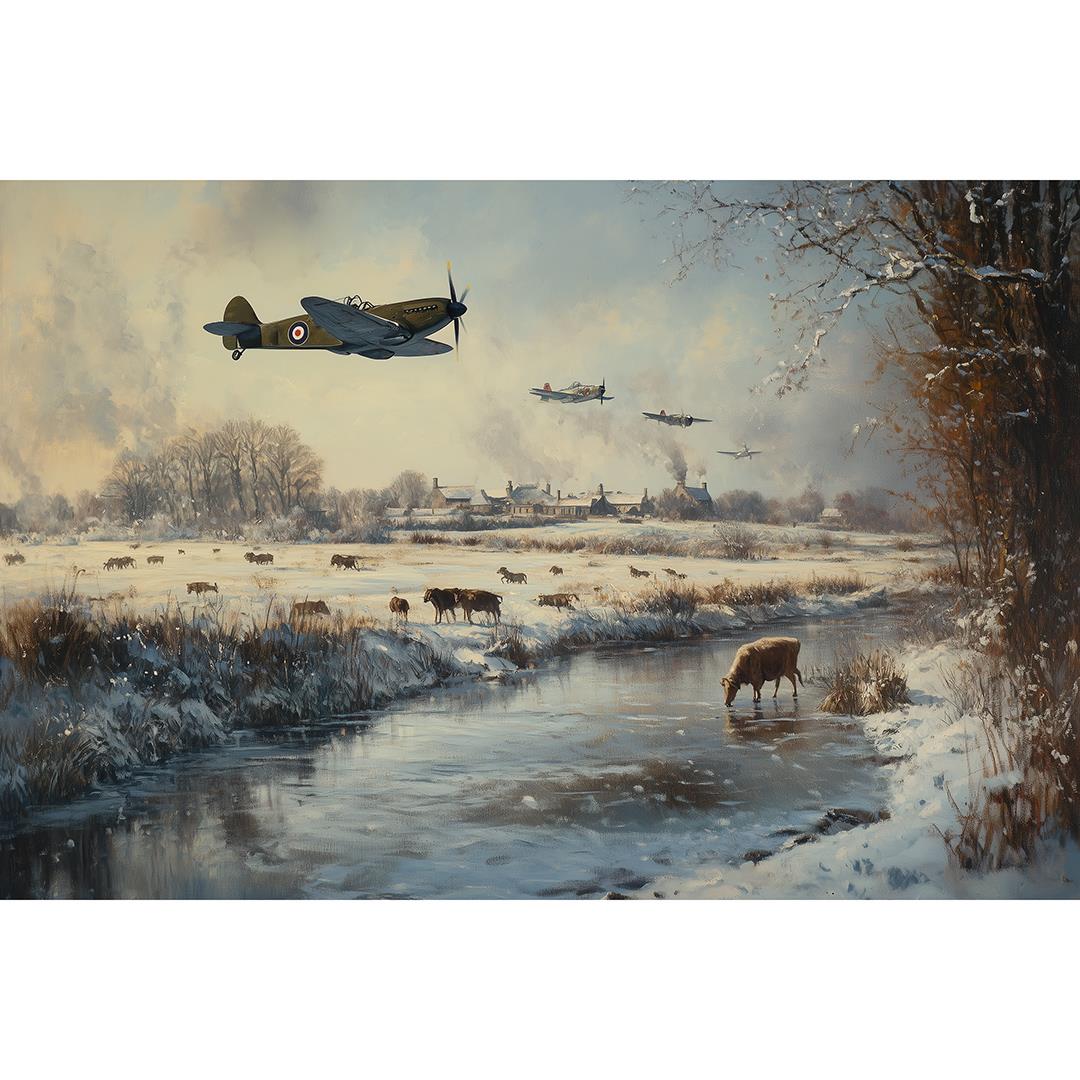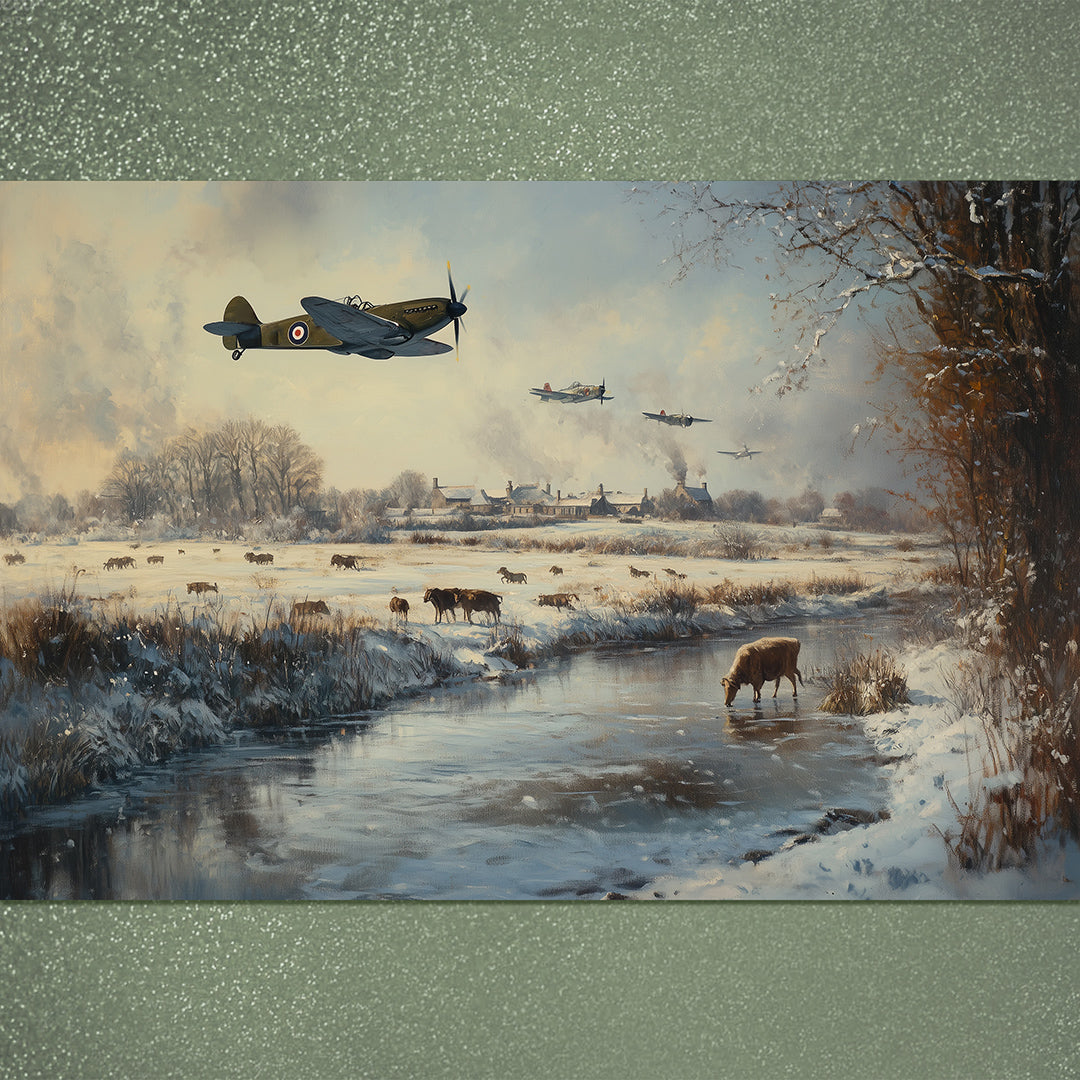 Frozen Flight Christmas Card. This beautifully designed Christmas card features a winter landscape scene with a fleet of aircraft flying over livestock and a frozen river .