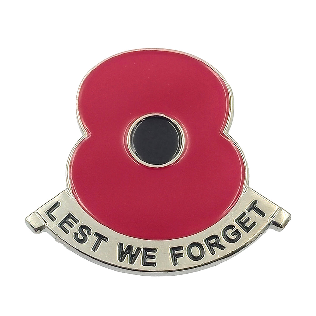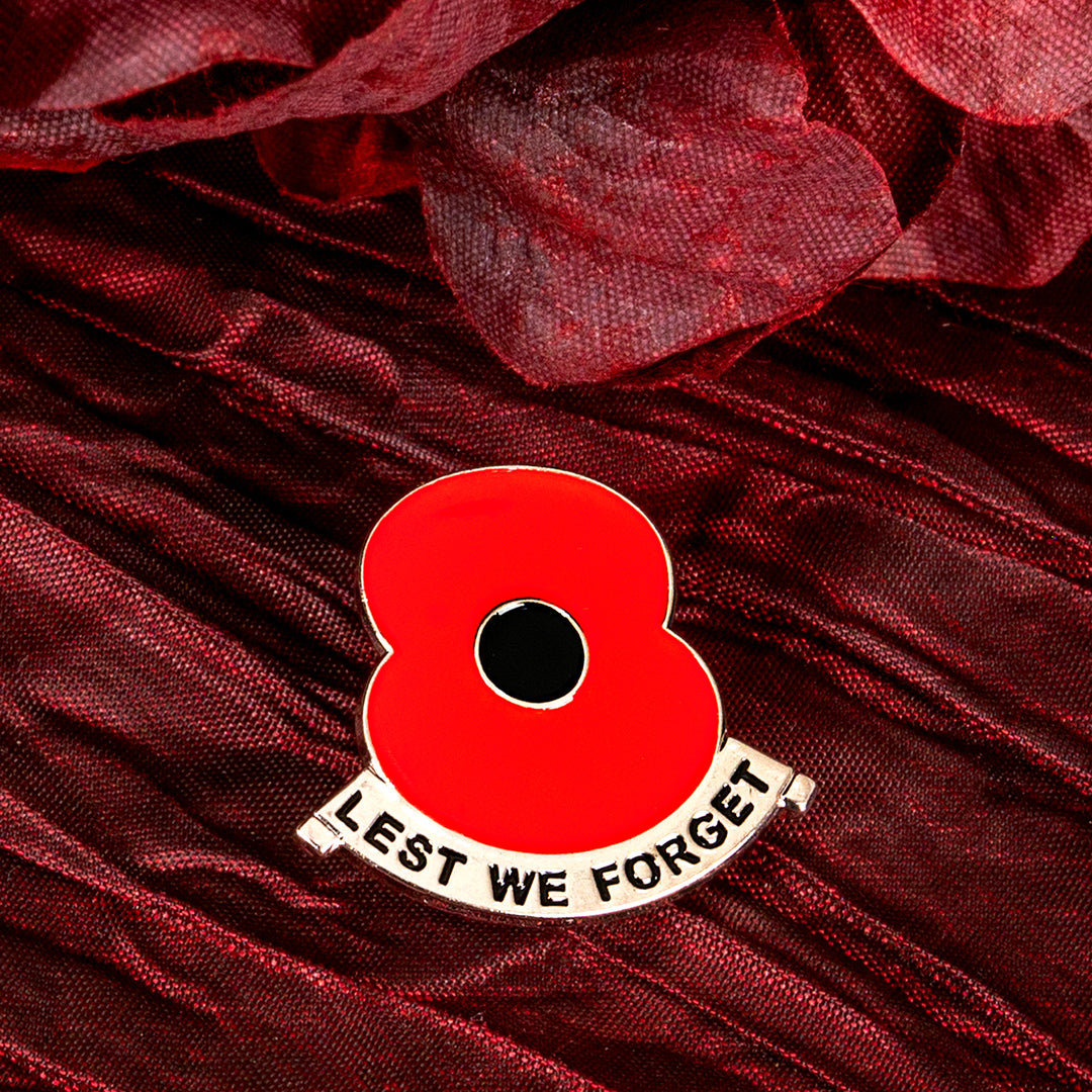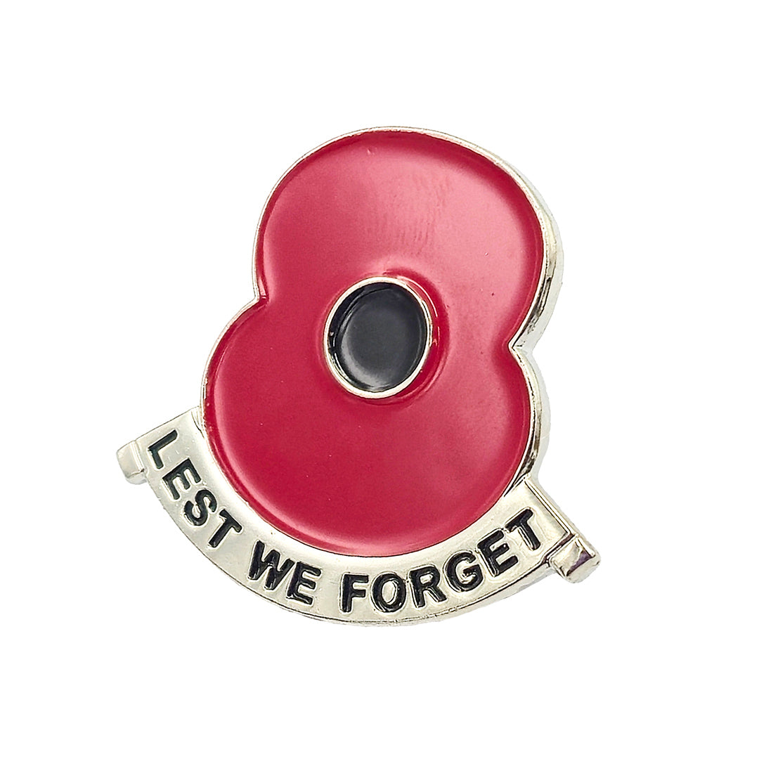 Featuring the iconic red poppy symbol, prominently displayed with the words "LEST WE FORGET" on a silver-tone scroll beneath it.