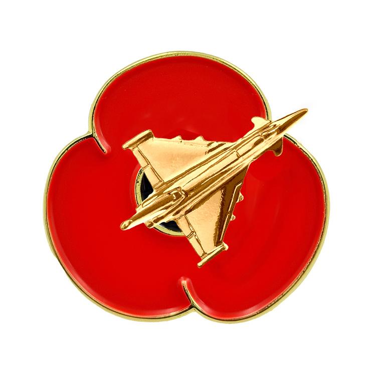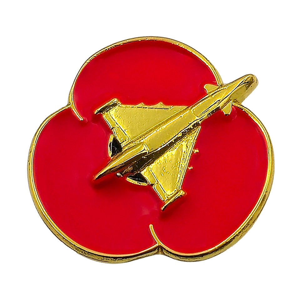 Typhoon 2cm Poppy Pin Badge. This mini 3 petal Typhoon poppy pin stud features a gold effect Typhoon aircraft flying across a bold red poppy. Smaller than our main Remembrance poppy range these pins are a new addition to our popular pin badge collection.