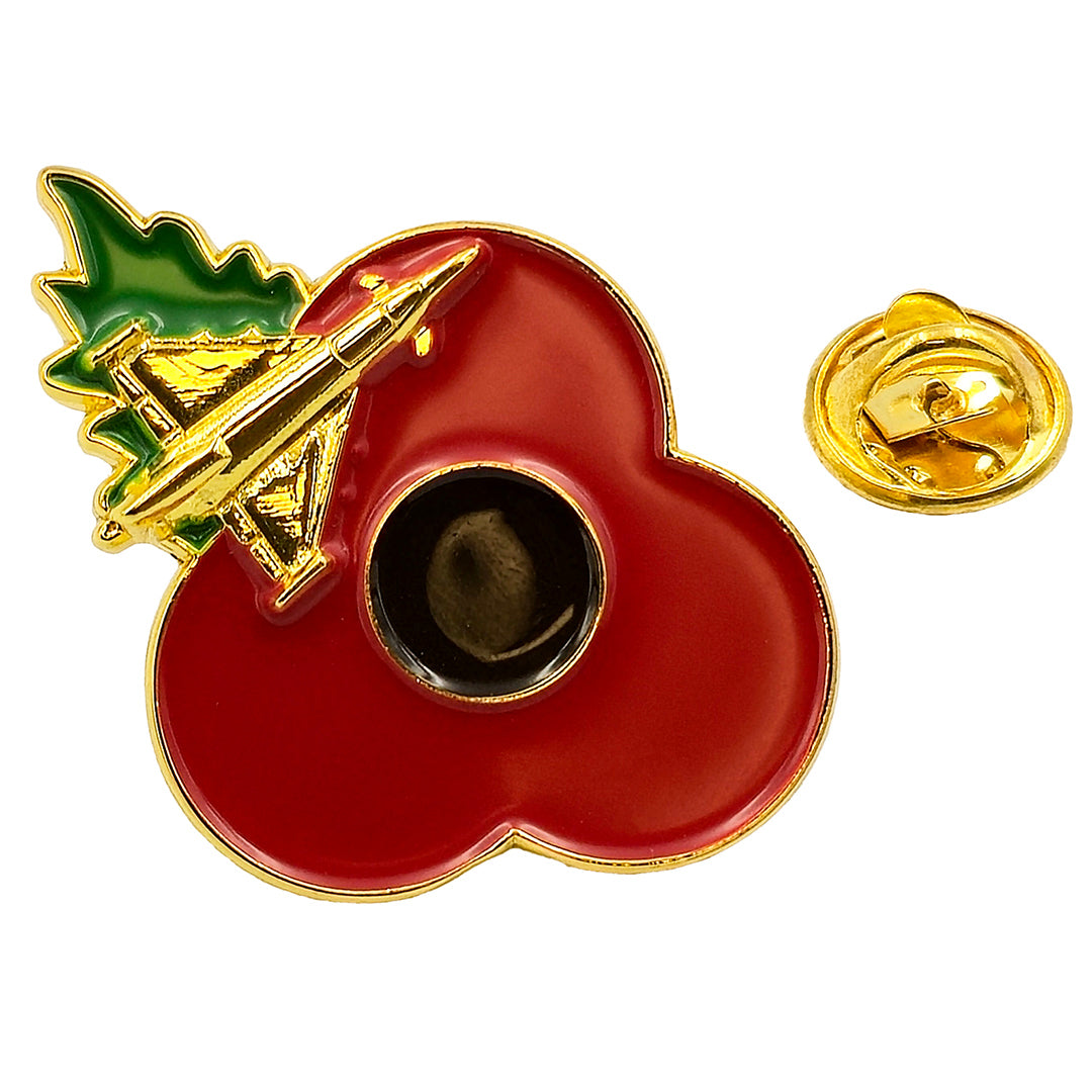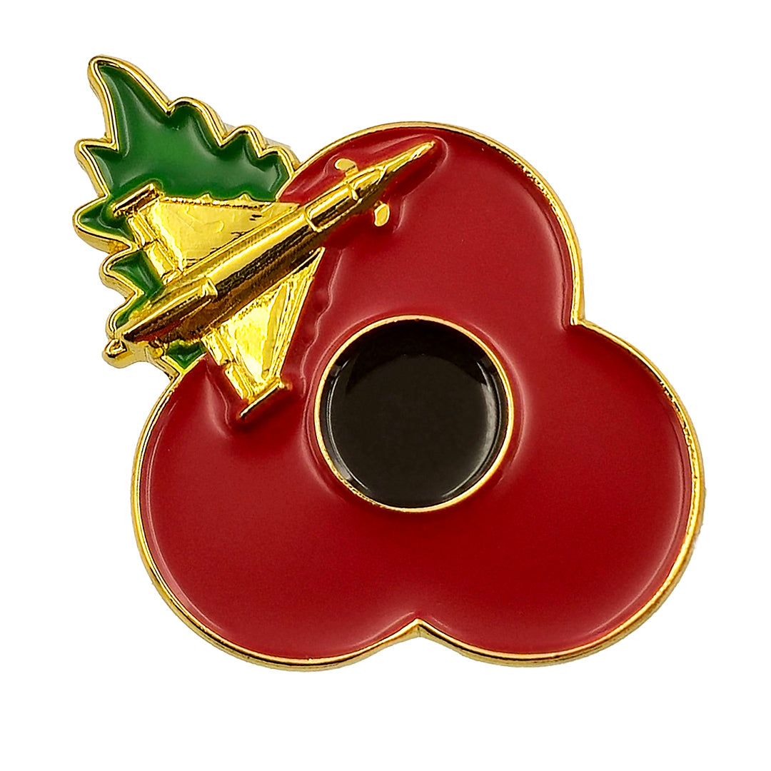 Brand NEW Typhoon Poppy Pin. Designed in-house and only available exclusively from the RAF Association. This Poppy features the world-famous RAF Typhoon aircraft, inside our 3 petal red Remembrance poppy. This red Remembrance poppy pin badge is ideal to wear at any occasion of remembrance.